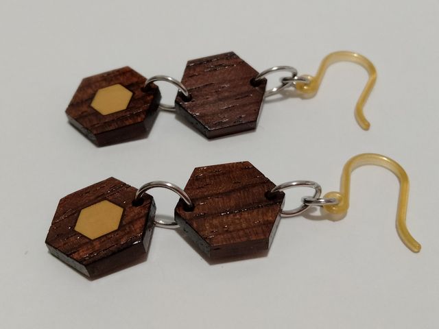 ヘキサゴンダブル(黄楊象嵌入り) 材質/本紫檀材・黄楊材 仕上げ/ウレタン 取付具/樹脂 サイズ/厚み2mm×10mmM6×2 価格/3,300円(税抜価格3,000円) |