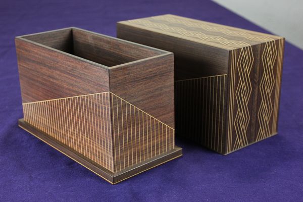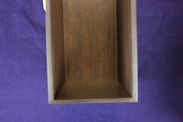 上蓋の内側の側4面は花梨の柾、上面の裏は黒い色の本紫檀と花梨で寄木にしました。