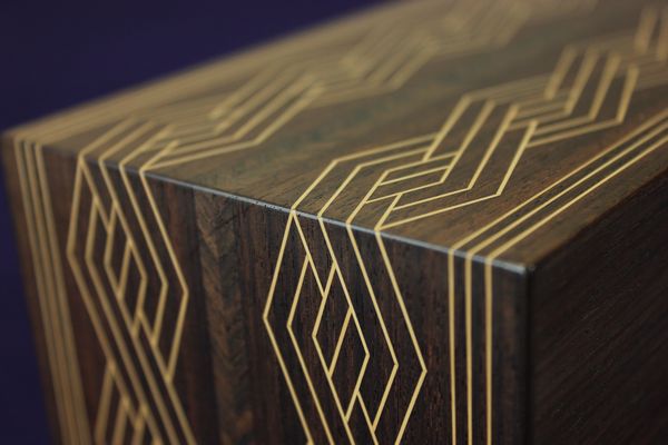本紫檀の柾にツゲでの線象嵌、伝統的な幾何学文様を使って華飾しました。
