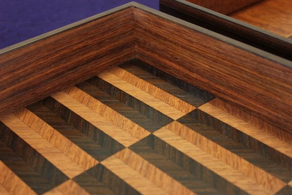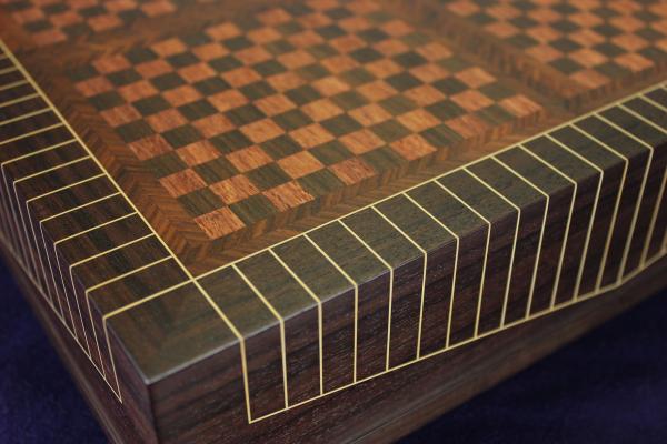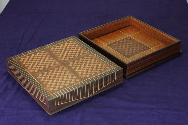 市松模様を本紫檀の寄木で囲み同じ物を5枚作り、表に4枚その際から側面に掛けてツゲの線象嵌、