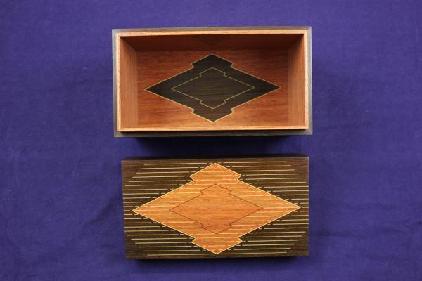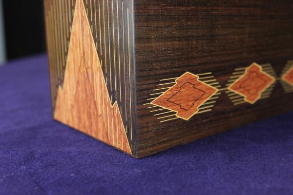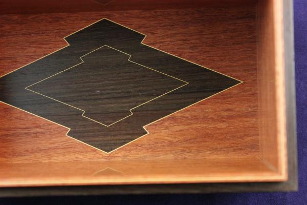 中の板と底板は花梨の柾を使用し、底板に黒い色の本紫檀の花菱文様を象嵌縁取りと中に同じ花菱をツゲの線象嵌を入れました。
