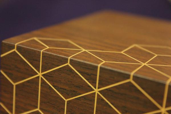 浅井唐木では、木象嵌するのが寄木などの板類とツゲの線の二種類で行います。