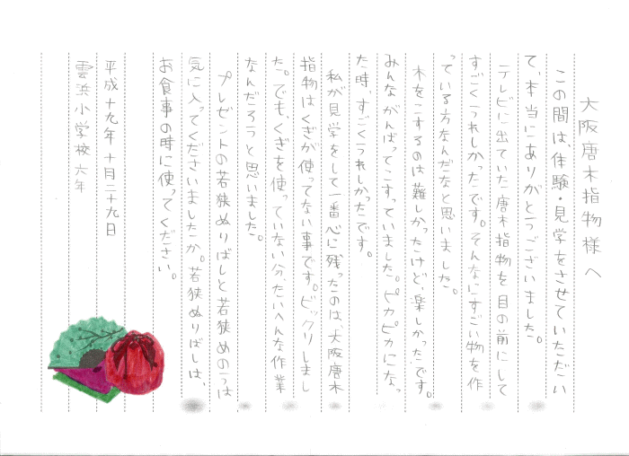 | 2007/10/26 6年生2クラス修学旅行を兼ねて大阪と奈良の伝統工芸を見学 大阪唐木指物には10名 雲浜小学校の今回の見学の目的 ・大阪の伝統工芸の見学や調査を通して伝統的な技術の素晴らしさに触れ、 受け継がれてきた歴史の重みや、受け継いでいくことの必要性に気付かせる ・大阪の伝統工芸と小浜市の伝統工芸の共通点や相違点について考えさせる ・伝統工芸に従事している方たちの工夫や苦労などについて理解を深めさせる |