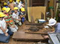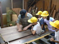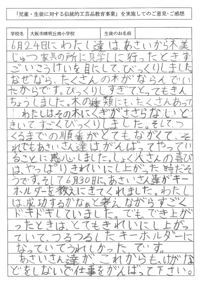 | 2008/06/24 4年生(2クラス)59名 晴明丘南小学校は、毎年見学に来られておりますが今年から 大阪唐木協同組合を通じて児童・生徒に対する伝統的工芸品教育事業として 事前にパンフレットおよび全国の伝統工芸産地が載っているポスター配布 弊社工房見学と日を改めて紫檀材キーホルダー磨きの体験を学校に出向いて指導 |